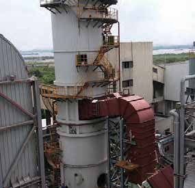 脱硫吸收液采用内外循环吸收相结合方式。吸收了SO2的喷淋水流入脱硫塔底部的循环池后,一部分浆液由内循环泵重新打回喷淋层,进行下一次喷淋。同时,为了保持脱流液中脱硫剂浓度的相对稳定,从循环池分出部分循环水进入再生池,与脱硫剂制备系统输送过来的石灰浆液充分混合再生,再生后的浆液在沉淀池进行沉淀。沉淀后渣由渣浆泵打出进入真空皮带机进行脱水处理,经过沉淀后的上清液流入缓冲池循环利用,与钠碱罐加入的烧碱调节至运行值后由外循环泵重新打回脱硫塔,形成系统内部循环利用。