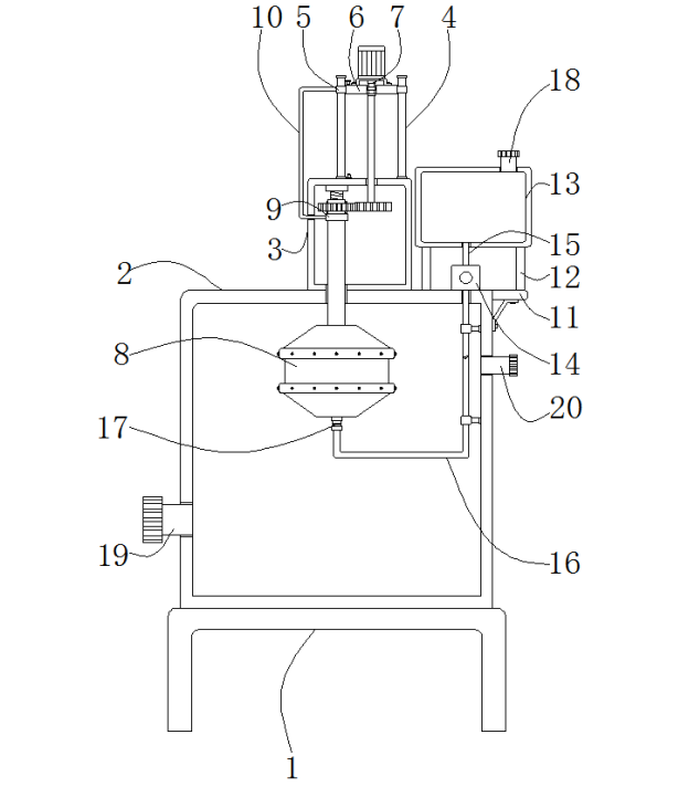 3.根据权利要求2所述的脱硫剂加料装置,其特征在于:所述支撑杆(12)的顶端固定安装有储料箱(13),所述箱体(2)的表面且位于所述防护箱(3)的一侧固定安装有水泵(14),所述水泵(14)输入端连通有进液管(15),所述水泵(14)输出端连通有U形出液管(16)。
