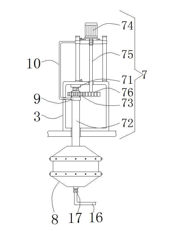 工作原理:操作者首先将液体的脱硫剂通过注液管18注入储料箱13的内部,当储料箱13的内部加满液脱硫剂后,再启动电机74带动转动杆75进行转动,当转动杆75转动时带动第二齿轮76在防护箱3的内部进行转动,当第二齿轮76转动时带动第一齿轮73进行转动,当第一齿轮73转动时带动内螺纹套管72在螺纹杆71的表面进行转动,防护箱3的内部进行转动,当内螺纹套管72转动时带动环形喷管8在箱体2的内部进行升降和转动,当内螺纹套管72向箱体2的内部移动时通过轴承9带动U形连接杆10向防护箱3的一侧移动,当U形连接杆10的移动时通过滑块5和连接板6带动电机74在滑杆4的表面进行移动,当环形喷管8转动时启动水泵14将储料箱13内部的液体脱硫剂通过进液管15将液体脱硫剂送入U形出液管16。