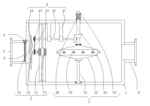 连接管34带动喷流器32转动,且还原剂通过进气管36经连接管34进入到喷流器32内部然后通过喷头33喷出,通过带动喷流器旋转可以使气流快速的充满箱体1,并且旋转可以更加快速的带动气流之间混合,提高烟气脱硝的效率与质量,脱硝完成的气体通过排气管6排出;