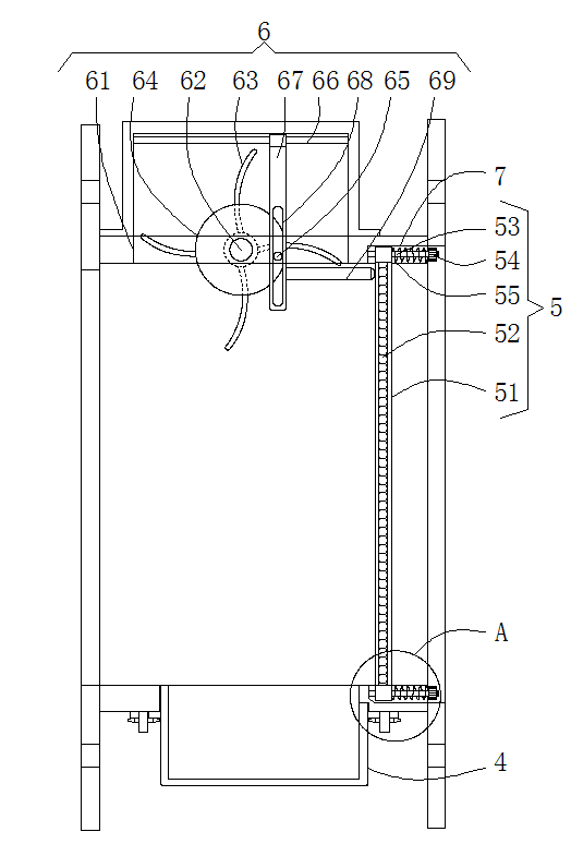 同时当烟气进入过滤箱2内部时气流推动叶轮63的下侧,从而使叶轮63转动,叶轮63转动从而带动转动轴62转动,带动轴65带动转动盘64转动,转动盘64带动边侧的带动轴65沿转动盘的中心为圆心转动,且带动轴65沿移动板67上滑槽68滑动,从而带动移动板67左右往复移动,移动板67带动推动轴69左右往复移动,推动轴69不断的对滤芯进行敲击,从而可以使滤芯52上粘附的固体颗粒容易掉落到收集盒4内部,延长滤芯52的使用寿命;