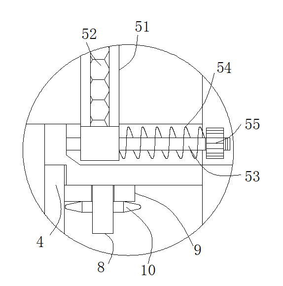 当需要对收集盒4进行清理时,通过将星型螺母10从螺纹固定轴8上拧下,即可将收集盒4取下进行清理,安装时,对应将收集盒4上侧插入到过滤箱2底部的装配孔内部,且收集盒4两侧的固定块9上的固定孔对应插入到螺纹固定轴8上,然后通过星型螺母10固定螺紧;